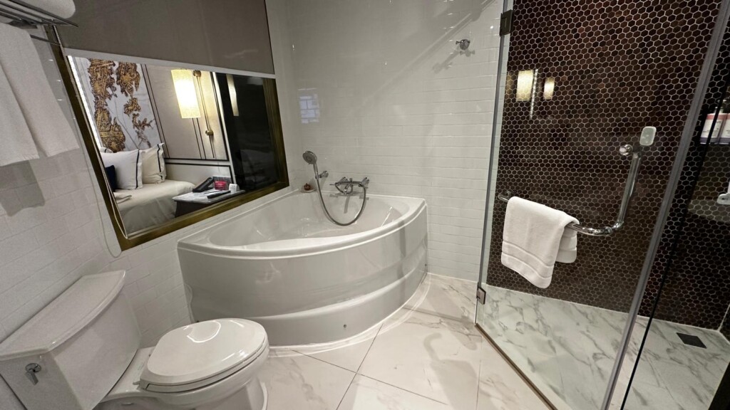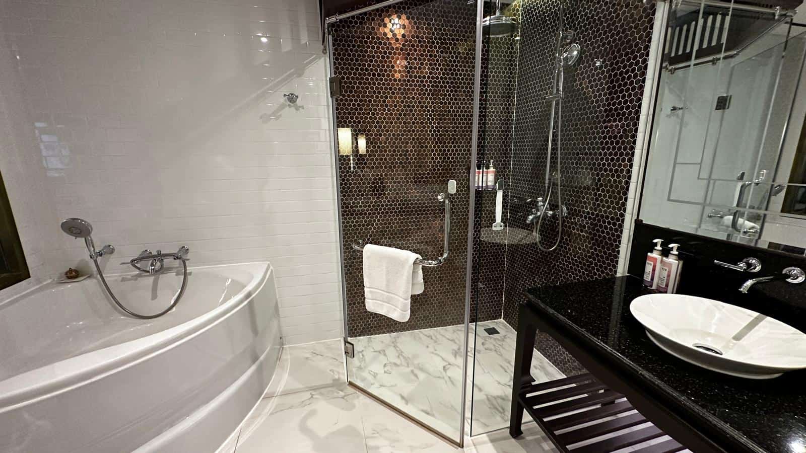 Exquisite Room Design: The suite I stayed in was a masterpiece of design. With a luxurious king-sized bed and tastefully curated interiors featuring elegant patterns and Thai-inspired motifs, the room immediately felt like a private sanctuary. The marble-tiled bathroom was equally stunning, boasting a corner bathtub perfect for unwinding and a sleek rain shower. A large mirror facing the room added a touch of openness, creating a seamless blend of relaxation and sophistication.