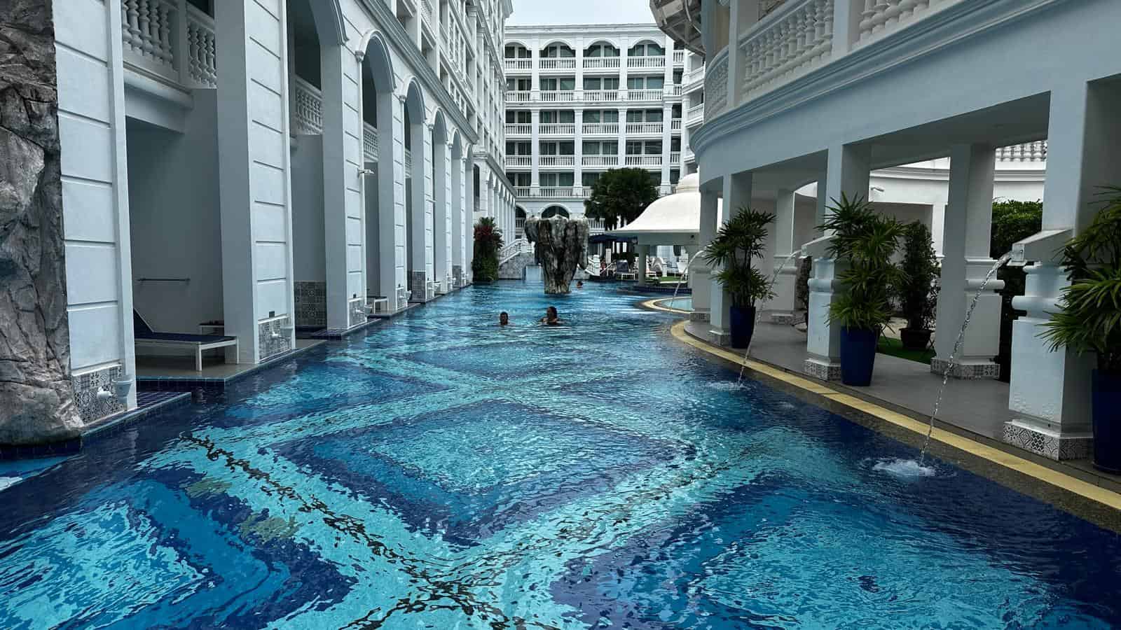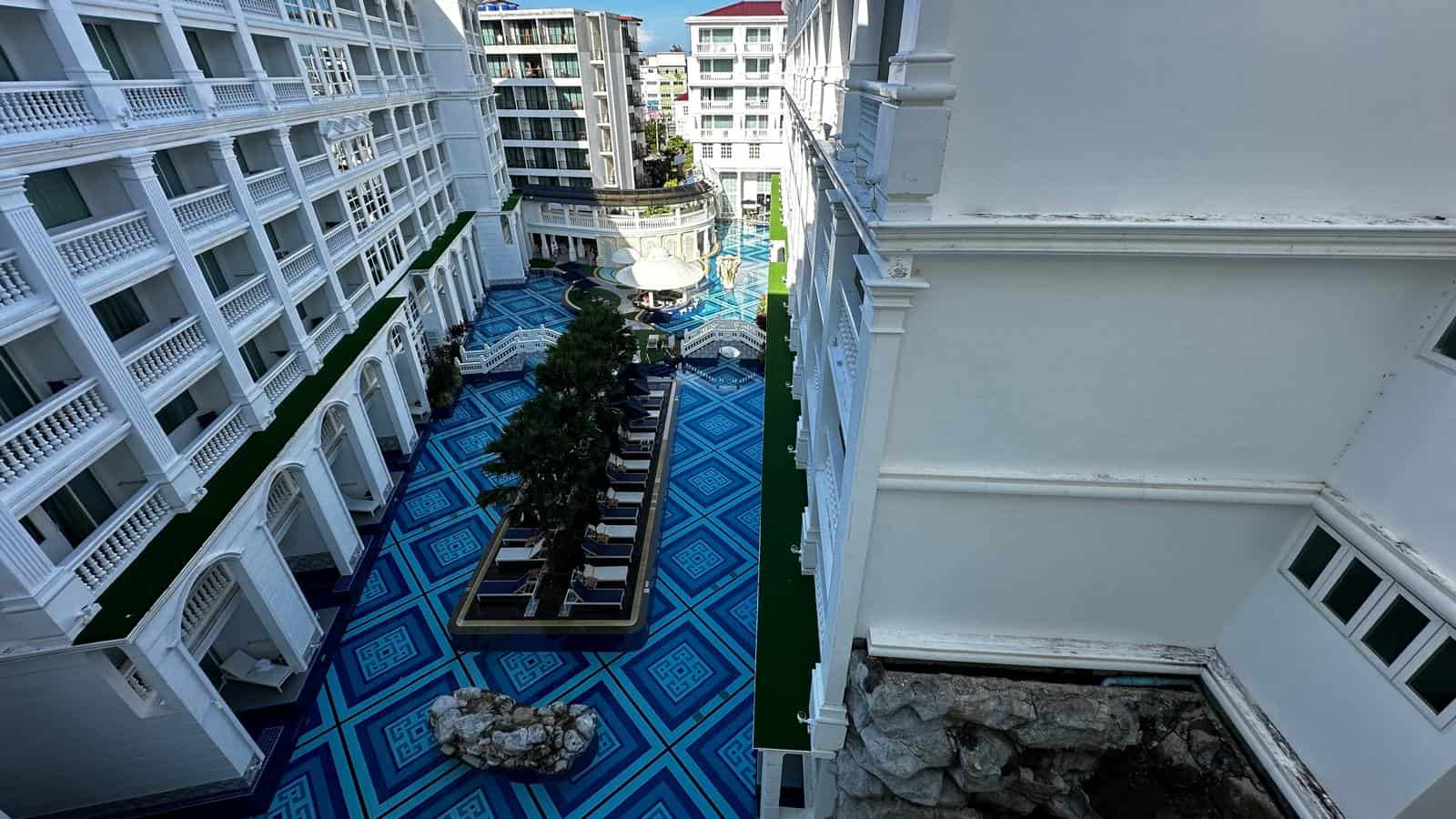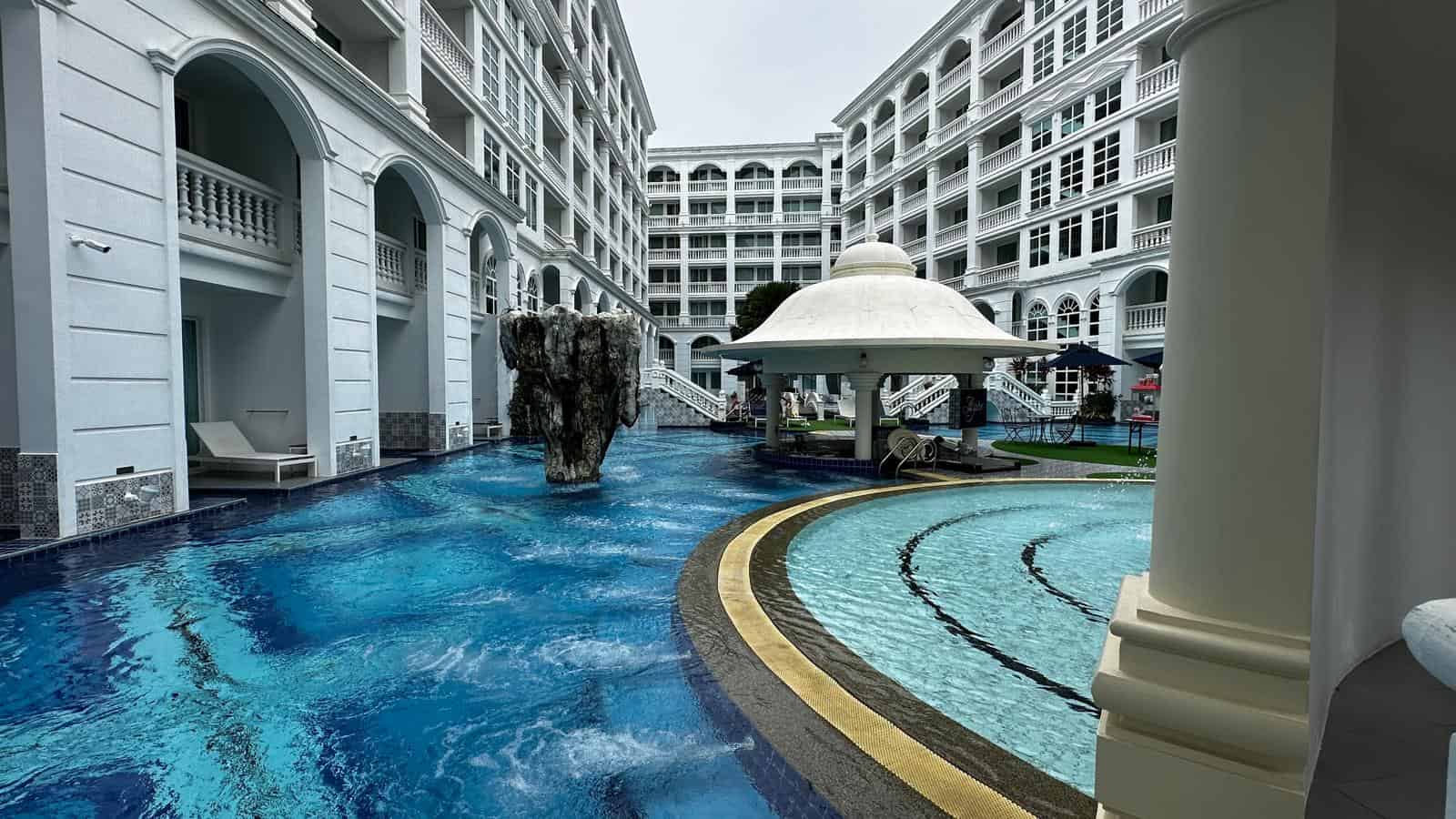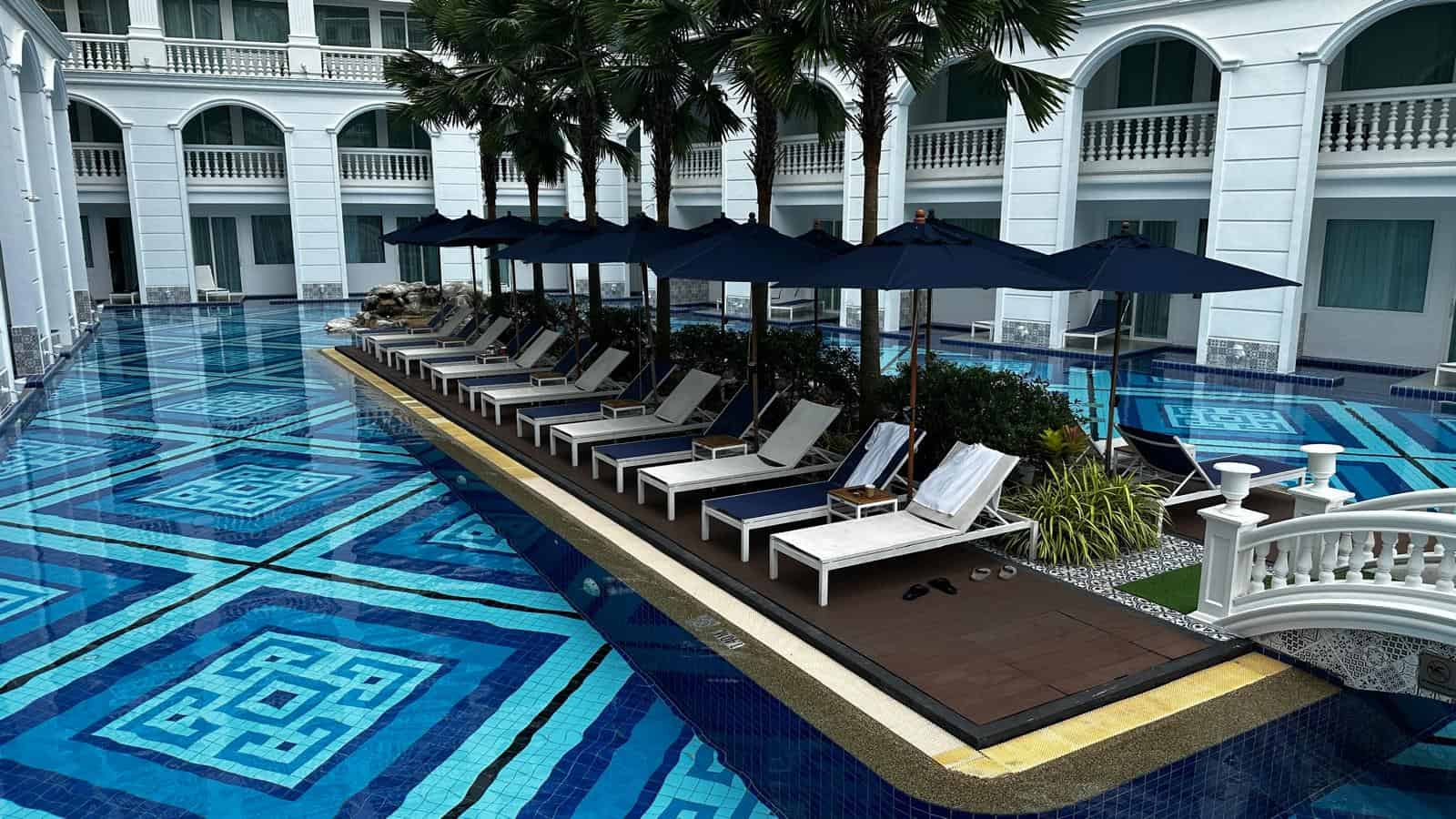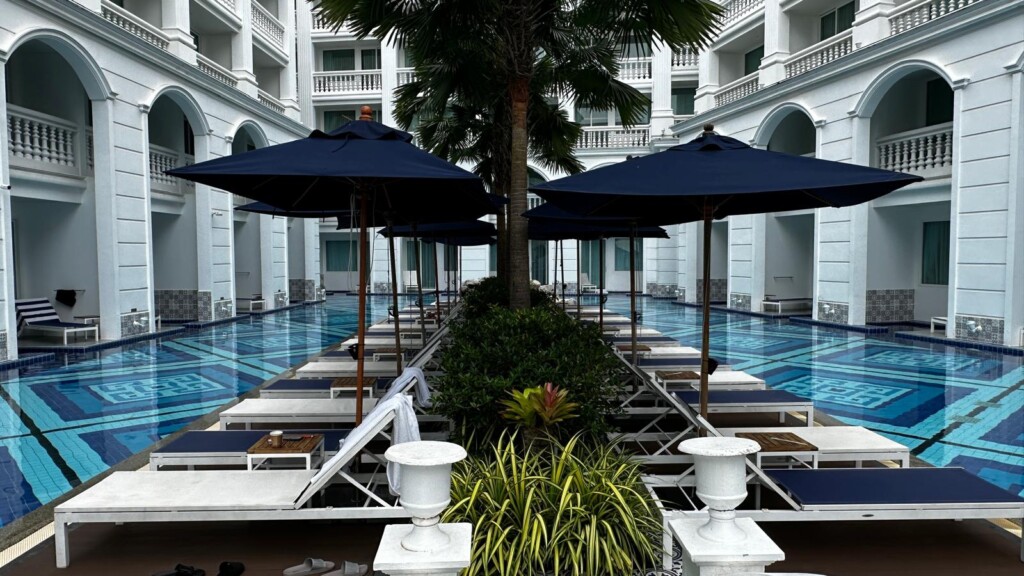 World-Class Facilities and Architecture: The pool area was a standout feature, offering a visual feast with its intricate tiled designs and tranquil surroundings. The contrast of classical white columns and a serene rock garden added to the ambience, making it the ideal spot to relax or snap some Instagram-worthy shots. For those seeking more privacy, cabanas nestled near the poolside provided an intimate space to enjoy the sun.