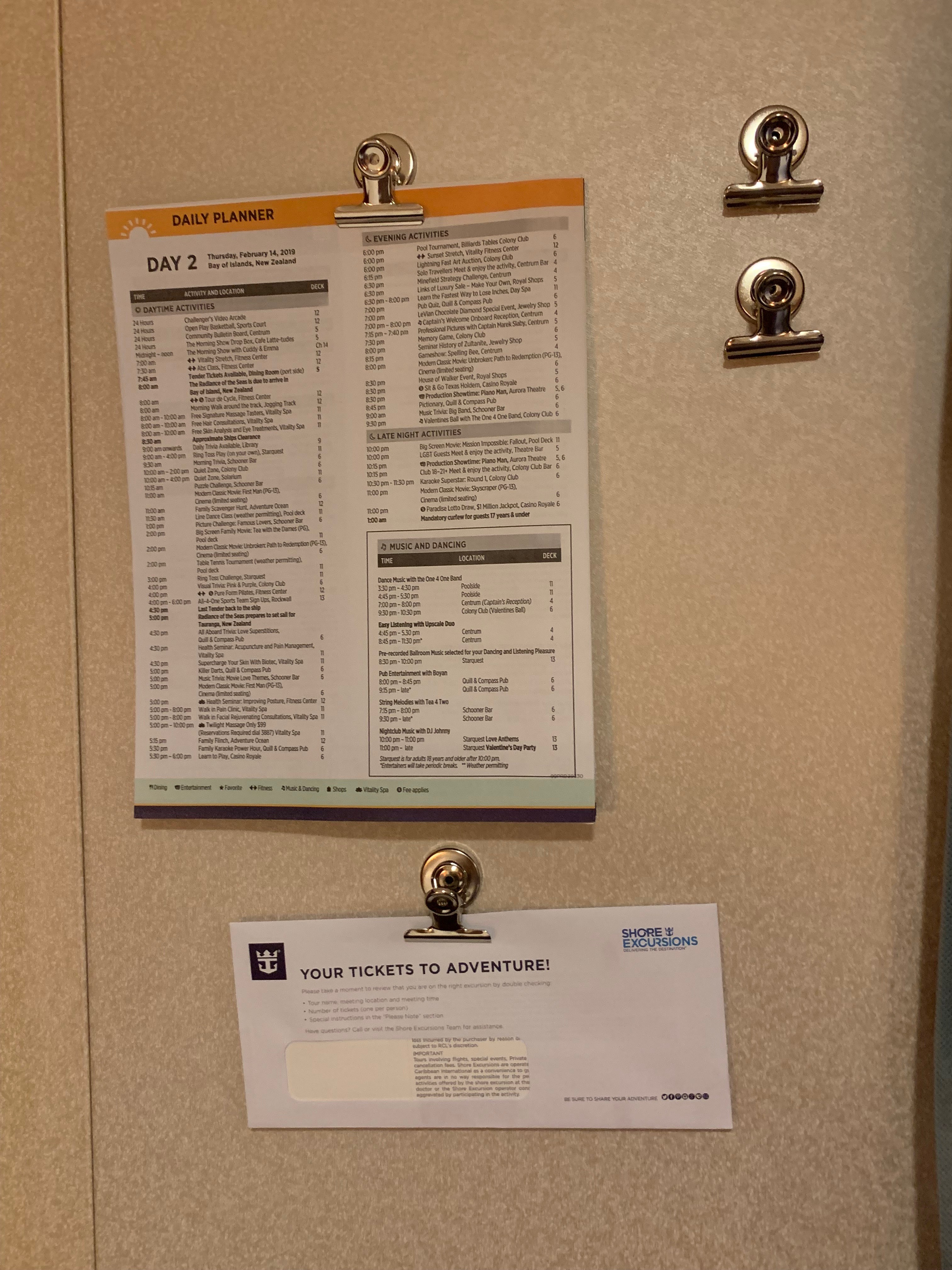 - The use of magnetic bulldog clips is ideal for use with your daily cruise news, and shore excursion tickets etc.