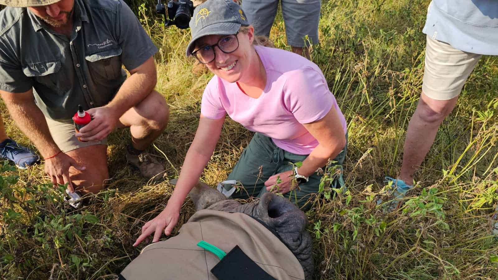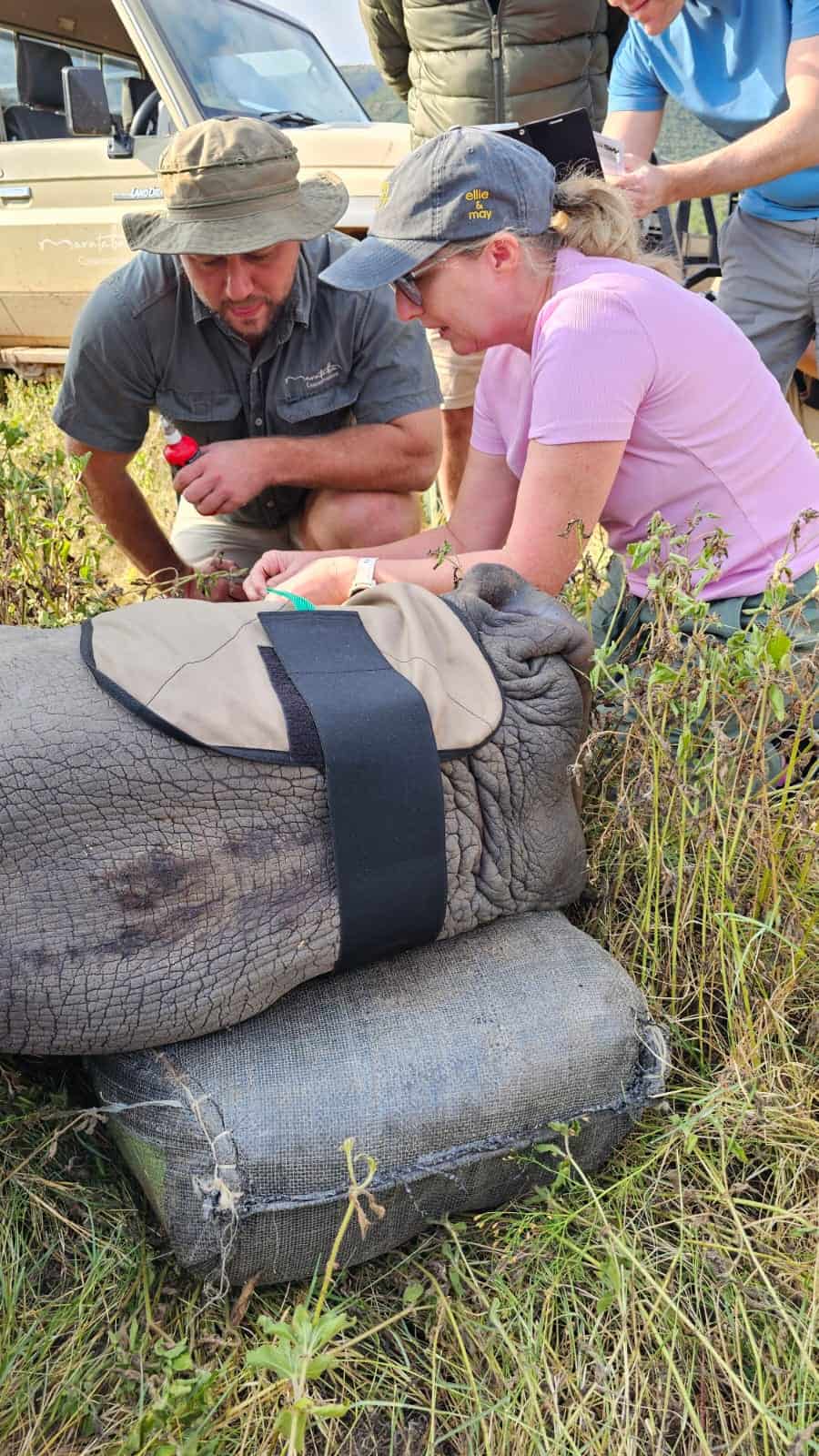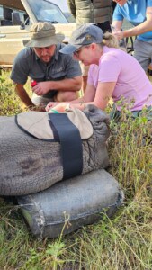 When signalled to do so, I gently leant over the head of the rhino, put the syringe into the hole in the horn and injected the microchip. We then filled the hole with PVA glue, rubbed some dirt over it and put in some small sticks – a bit like plugging a hole in the wall at home.I breathed a huge sigh of relief that I had successfully completed the task at hand.