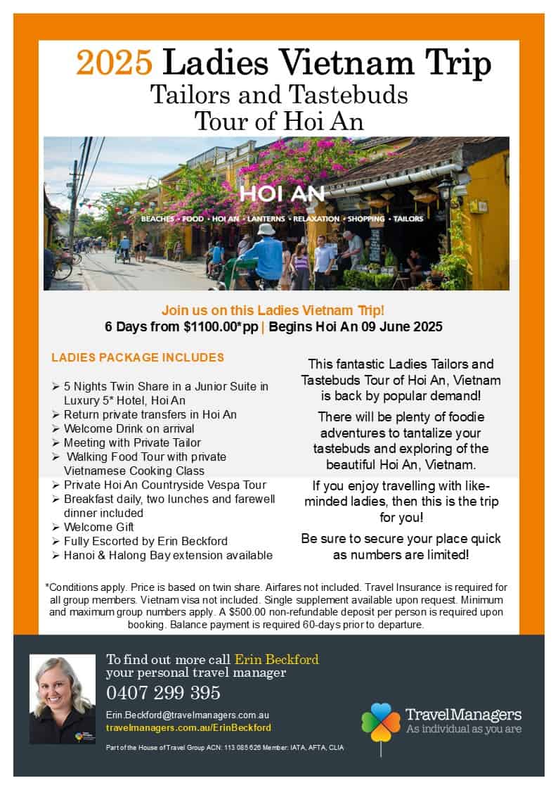 “We utilised Erin’s Personal Travel Manager services for the first time during 2017 and were very happy with her. She replied to all our queries and requests promptly, provided plenty of advice and suggestions, and was very pleasant to deal with. Ideal for busy clients like ourselves, it was very convenient to be able to plan, organise and book our entire travel itinerary with her just via phone calls and emails. And the best thing is her personal service - you are dealing with just the one/same person, not an entire office of different travel agents. Kind Regards Tran”