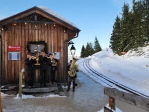 Surprising Experiences – An advent ride on the Schafberg Bahn cog railway is a treat, it’s a Christmas locomotive ride to Schafberg Alm, which sits 1364 meters above sea level. We were serenaded by four traditional trumpeters on top of the mountain whilst we sipped more mulled wine.