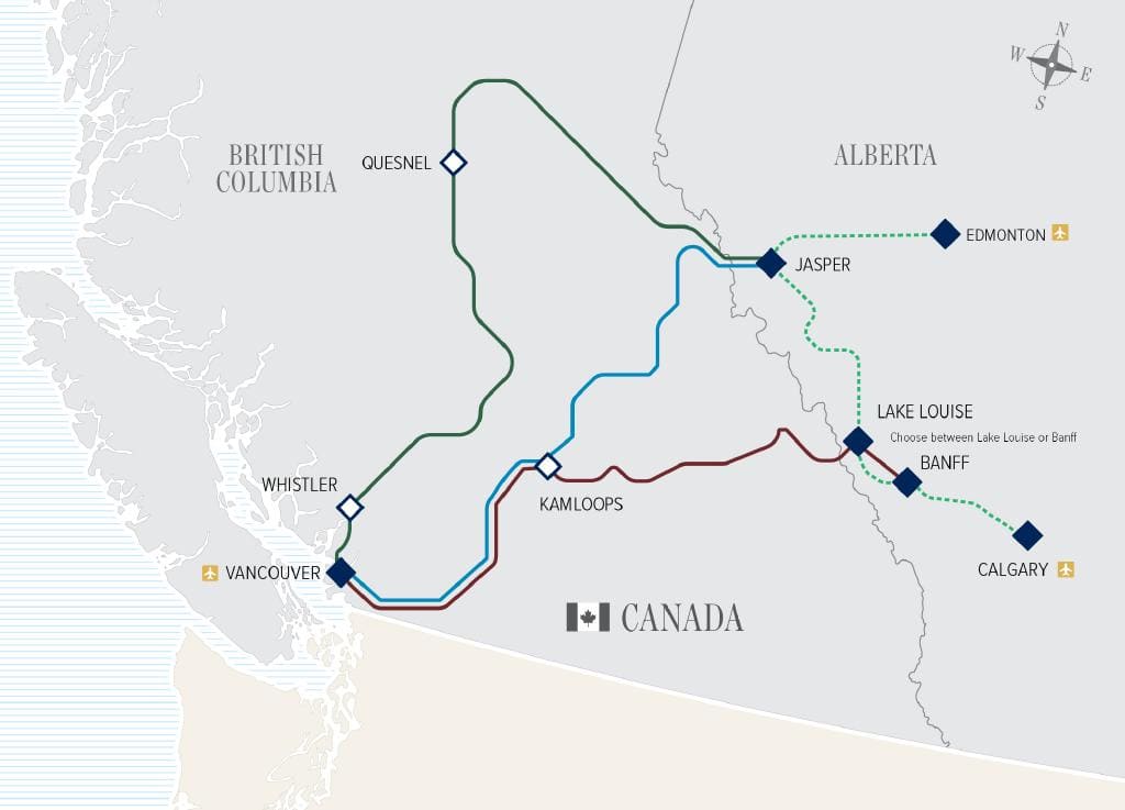 The two-day First Passage to the West route rolls along the historic tracks of the country’s first coast-to-coast railway between Vancouver and Banff or Lake Louise, with an overnight stay in Kamloops. Pass by the raging rapids of Hell’s Gate, the twin rail bridges of Cisco Crossing, historic Craigellachie -the site of the “last spike” driven into the Canadian Pacific Railway in 1885 – and experience the engineering marvel of the Spiral Tunnels. As you travel through Banff National Park, you’ll be awed by towering views of the snow-capped Castle Mountain and Mount Rundle. Stay in the idyllic mountain towns of Banff or Lake Louise, nestled amongst dense alpine forests and jewel-hued lakes. In Banff, explore an eclectic mix of shops, galleries, museums, and restaurants, wander along picturesque trails, and admire the ever-present Cascade Mountain. Located 40-minutes northwest of Banff, Lake Louise also offers stunning views set against the backdrop of its brilliant turquoise waters. Stay at the historic Fairmont Chateau Lake Louise and discover a landscape you’ve only ever dreamed of.